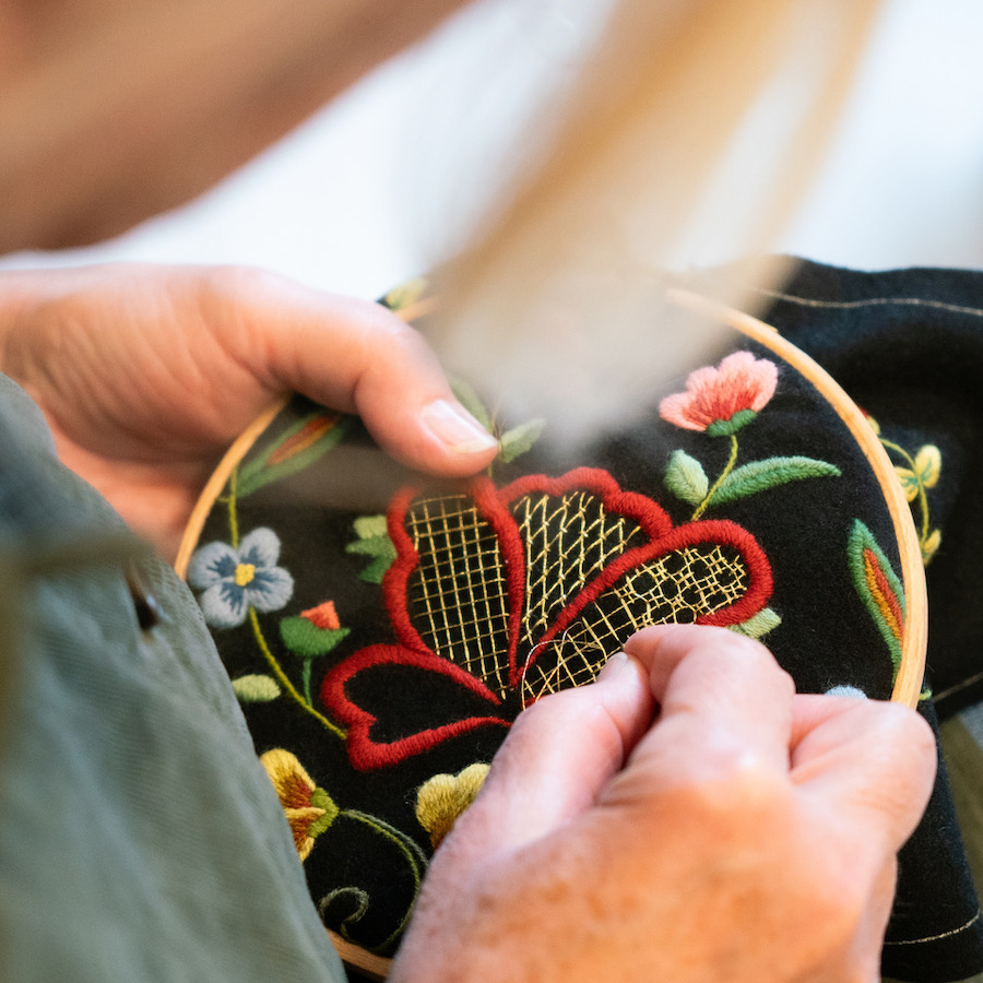En Sidserk organizan cursos temáticos para ayudar a esas personas que quieren mejorar su binad o confeccionárselo ellas mismas tanto online como presenciales. “Nuestro curso en línea más popular es el de bordado, donde se aprenden todas las técnicas básicas de puntada plana que usamos en la mayoría de los bunads con bordado de lana. Vendemos el curso con un paquete de materiales con ejercicios de dibujo, una muestra con patrón de bordado, hilo y aguja. Estoy trabajando en traducirlo al inglés”.