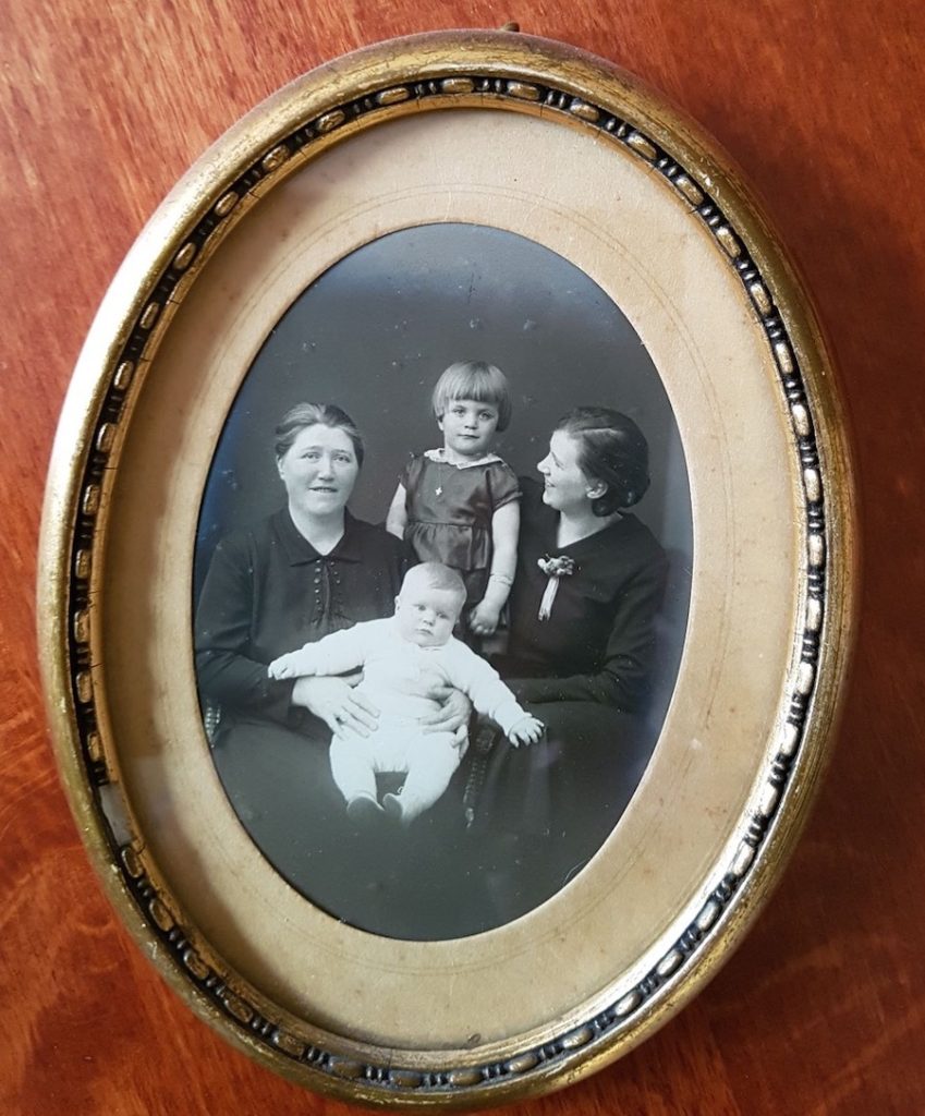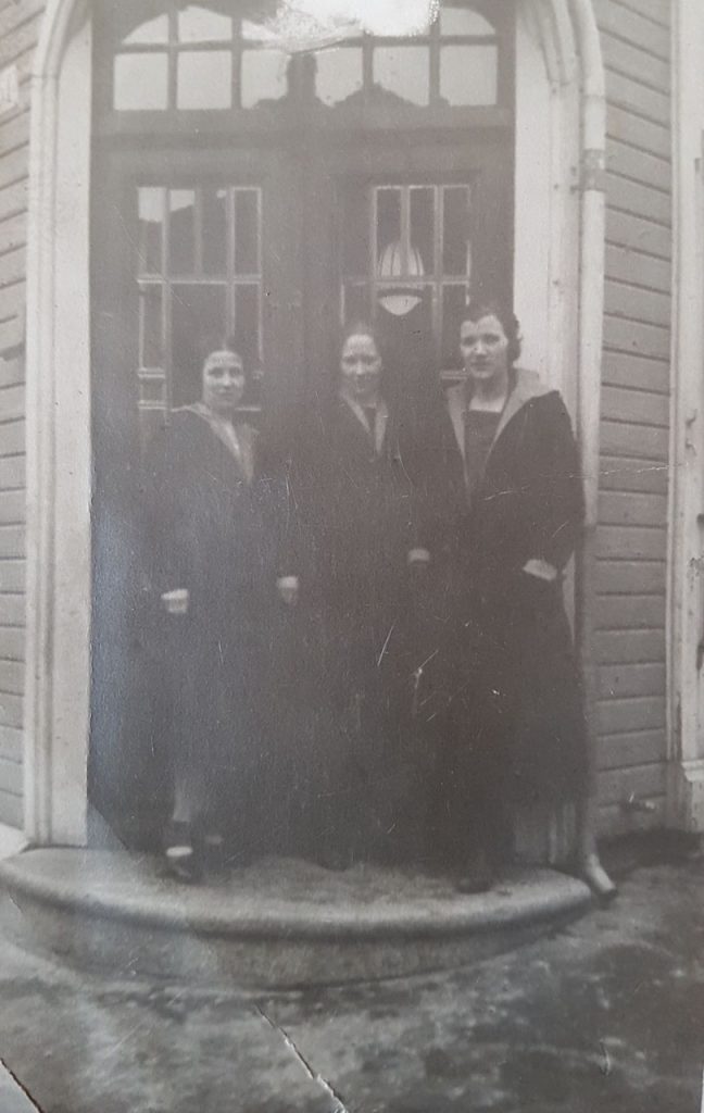 En la foto a blanco y negro y a la derecha, la bisabuela de Siri frente a la tienda de su tatarabuela en Haugesund. En la foto a color y a la izquierda, Ingeborg Therese (tatarabuela de Siri), Ingrid Sveen (abuela) en el centro y Haralda Therese (bisabuela) a la derecha.