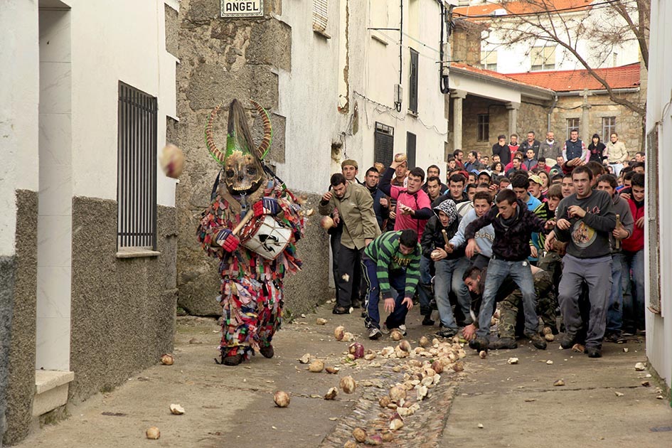 La figura de El Jarramplas recibe una lluvia de nabos en Piornal (Cáceres). Foto: Carlos González Ximénez.