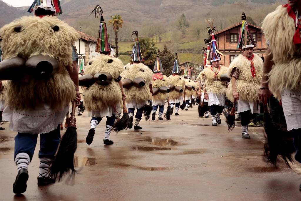 Los personajes, ataviados con trajes de pieles u hojas, tocados con coronas o cuernos de animales, tal y como lo hacían sus antepasados, desempeñan una función protectora. A través del estruendo de sus cencerros y otros instrumentos buscan ahuyentar los males y despertar a la tierra de su letargo invernal.