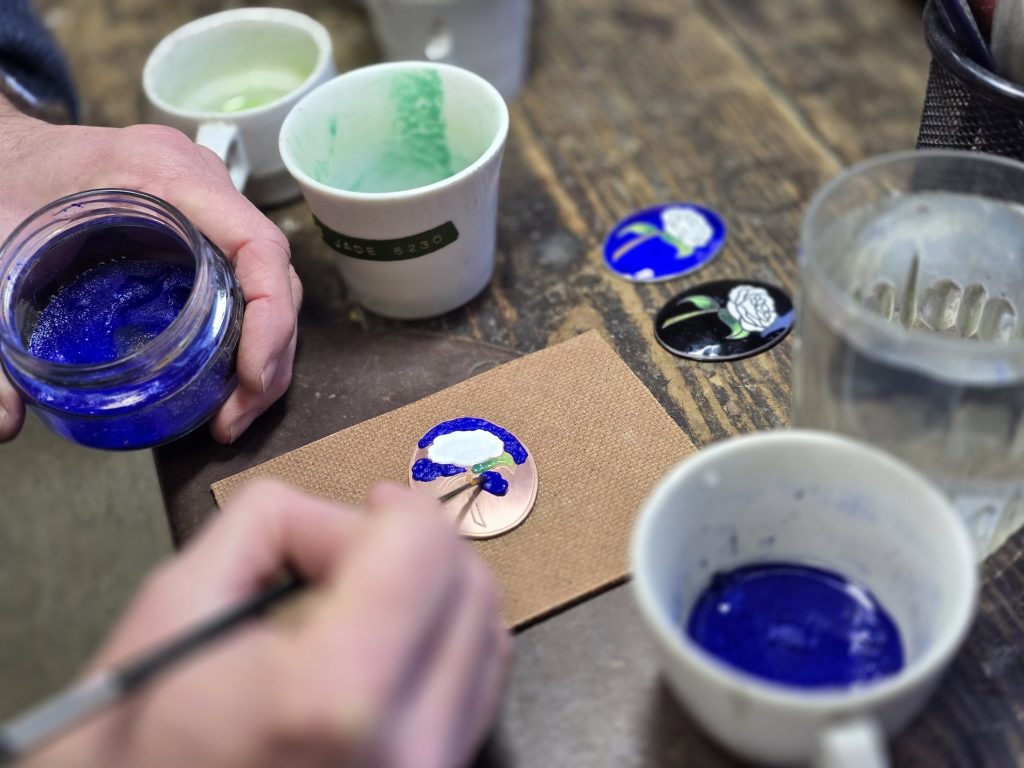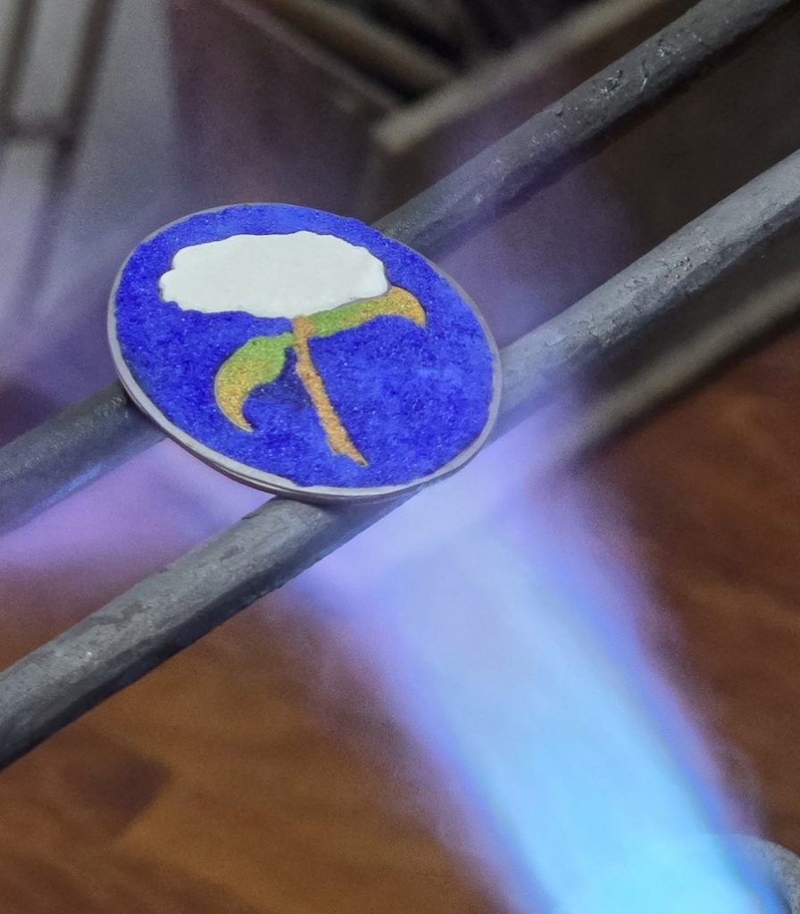 Eloy trabaja el esmalte al fuego con la técnica del ‘Champlevé’ o excavado y que consiste en dibujar con tinta sobre una chapa metálica y luego sumergirla en ácido para excavar los huecos que posteriormente van a ser cubiertos con esmalte de diferentes colores. “Con esta técnica resulta casi igual realizar piezas de gran tamaño (cuadros o placas) que otras de pequeñas dimensiones (insignias, broches, llaveros…) -comenta Eloy-. La mayor diferencia puede estar en el tipo de material que se utilice, que puede ser plata o cobre, pero el proceso es muy semejante en ambos casos”.