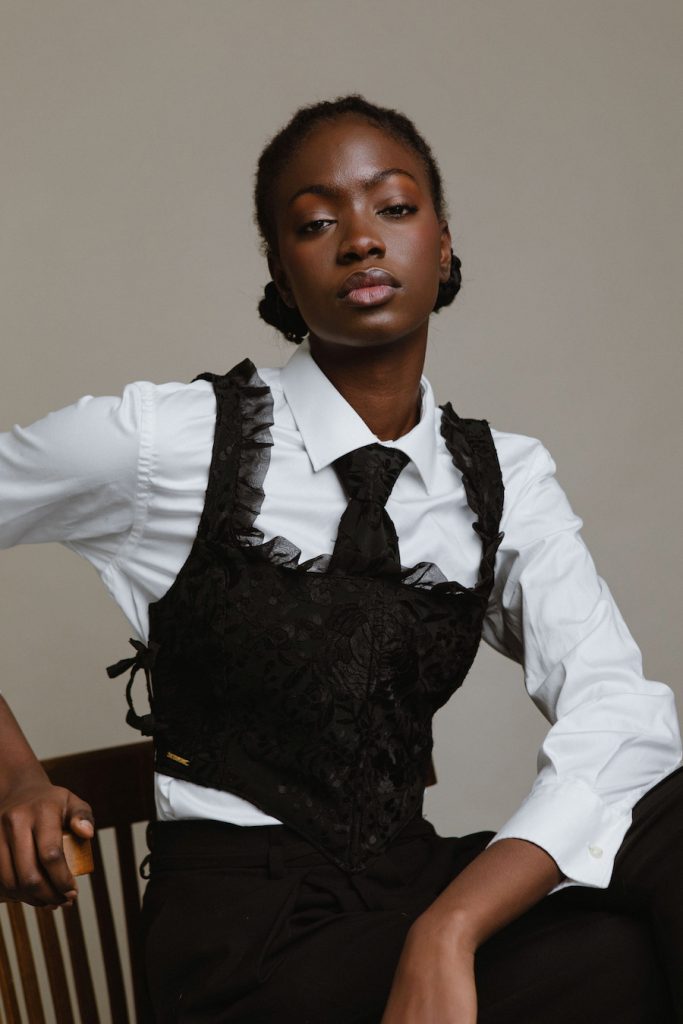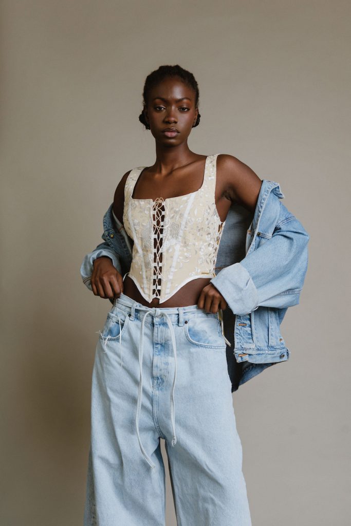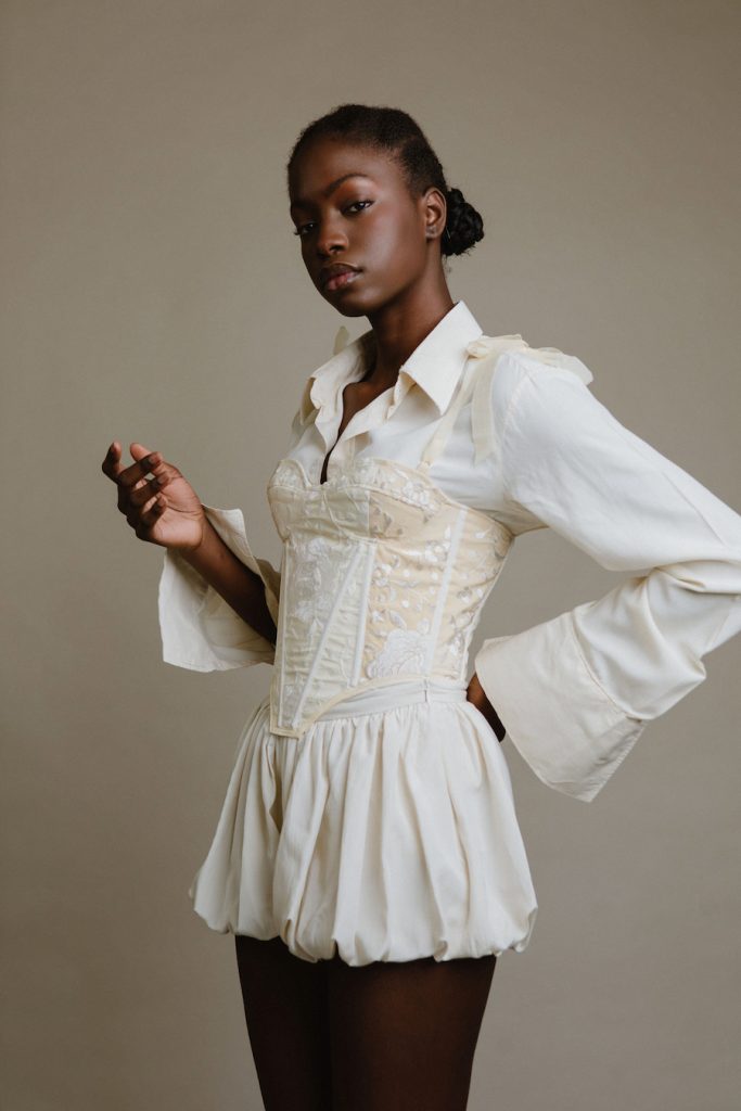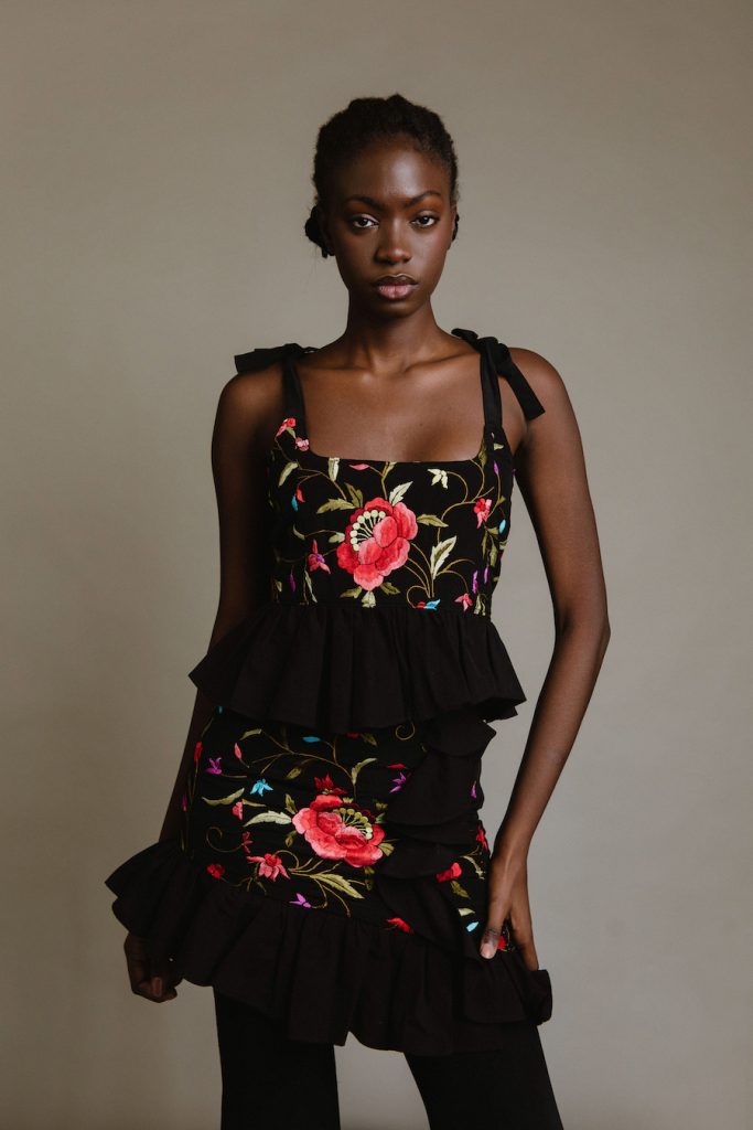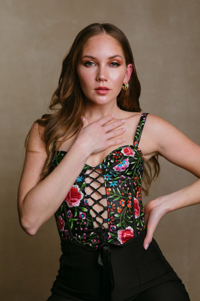 El bustier es una de las prendas realizadas por Ha’uraware utilizando un Mantón de Manila.