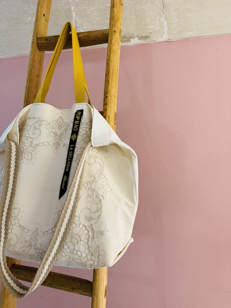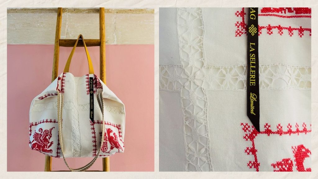 Las telas bordadas y el encaje usado en los bolsos de La Sellerie Limited procede de las labores que hicieron sus antepasadas.