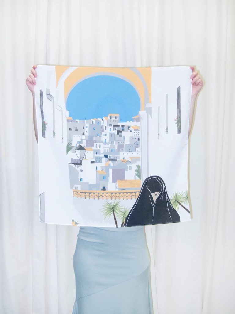 El diseñador Mario Cruz crea colecciones muy personales, atemporales y sostenibles. Además de su ropa urbana y ‘genderless’, uno de sus puntos fuertes son los accesorios, como los bolsos y los pañuelos realizados en estampación digital. En uno de sus modelos ha realizado un homenaje a la localidad de Verjer de la Frontera (Cádiz. España) con sus bonitas casas encaladas pero también ha plasmado uno de los símbolos de este hermoso pueblo del sur: La Cobijada.